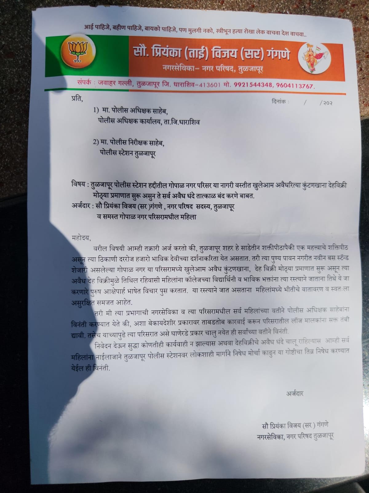 ४. आंदोलनाचा इशारा: हे निवेदन देऊन सुद्धा कोणतीही कार्यवाही न झाल्यास किंवा हे अवैध धंदे चालू राहिल्यास, परिसरातील सर्व महिलांना घेऊन नाईलाजाने तुळजापूर पोलीस स्टेशनवर लोकशाही मार्गाने निषेध मोर्चा काढण्यात येईल, असा स्पष्ट इशारा नगरसेविका प्रियांका गंगणे यांनी दिला आहे.