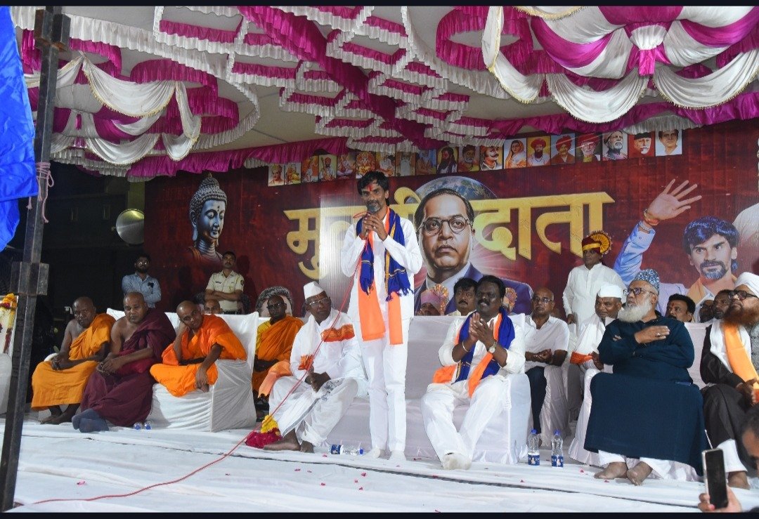 धाराशिव : विश्वरत्न, बोधिसत्व डॉ. बाबासाहेब आंबेडकर यांच्या १३५ व्या जयंतीनिमित्त बहुजन योद्धा सामाजिक संघटना आणि ‘डीएस ग्रुप’च्या वतीने आयोजित भव्य मिरवणुकीने धाराशिव नगरी दुमदुमून गेली. या उत्सवात मराठा संघर्षयोद्धा मनोज जरांगे पाटील यांची प्रमुख उपस्थिती आणि हभप, भन्तेजी, मौलाना यांच्यासह अठरापगड जाती-धर्मातील नागरिकांचा लक्षणीय सहभाग हे यंदाच्या जयंती सोहळ्याचे प्रमुख आकर्षण ठरले.