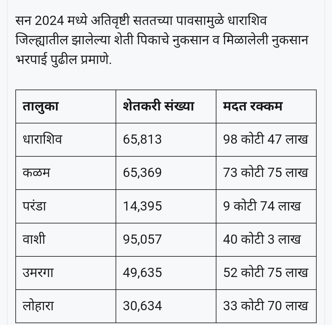 - सर्वाधिक मदत: क्षेत्रफळ आणि शेतकरी संख्या पाहता लोहारा तालुक्याला सर्वाधिक मदत मिळाली आहे. २९ जुलै रोजीच्या शासन निर्णयानुसार उमरगा आणि लोहारा तालुक्यातील शेतकऱ्यांना मदत जाहीर झाली असून, तिचे वितरण आठवडाभरात पूर्ण होईल.
