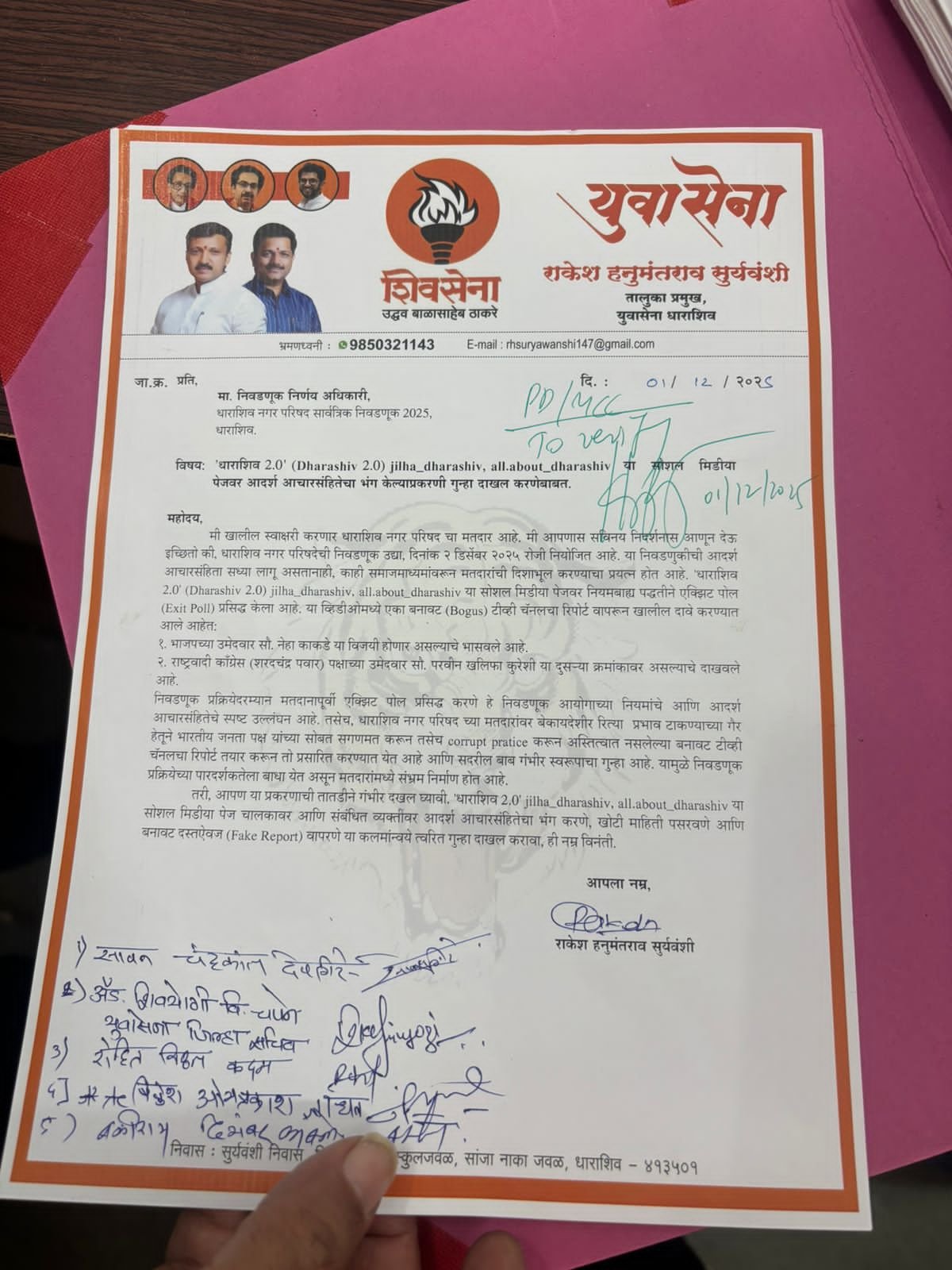 धाराशिव: धाराशिव नगर परिषदेच्या सार्वत्रिक निवडणुकीसाठी उद्या (दि. २ डिसेंबर) मतदान प्रक्रिया पार पडणार आहे. मात्र, मतदानाच्या अवघ्या काही तास आधीच सोशल मीडियावर प्रसारित करण्यात आलेल्या एका कथित आणि बनावट ‘एक्झिट पोल’मुळे शहरात राजकीय खळबळ उडाली आहे. आदर्श आचारसंहितेचा भंग करून मतदारांची दिशाभूल केल्याप्रकरणी ‘धाराशिव 2.0’ (Dharashiv 2.0) आणि इतर संबंधित सोशल मीडिया पेजेसवर त्वरित गुन्हा दाखल करावा, अशी मागणी मतदार राकेश हनुमंतराव सुर्यवंशी यांनी निवडणूक निर्णय अधिकाऱ्यांकडे केली आहे.