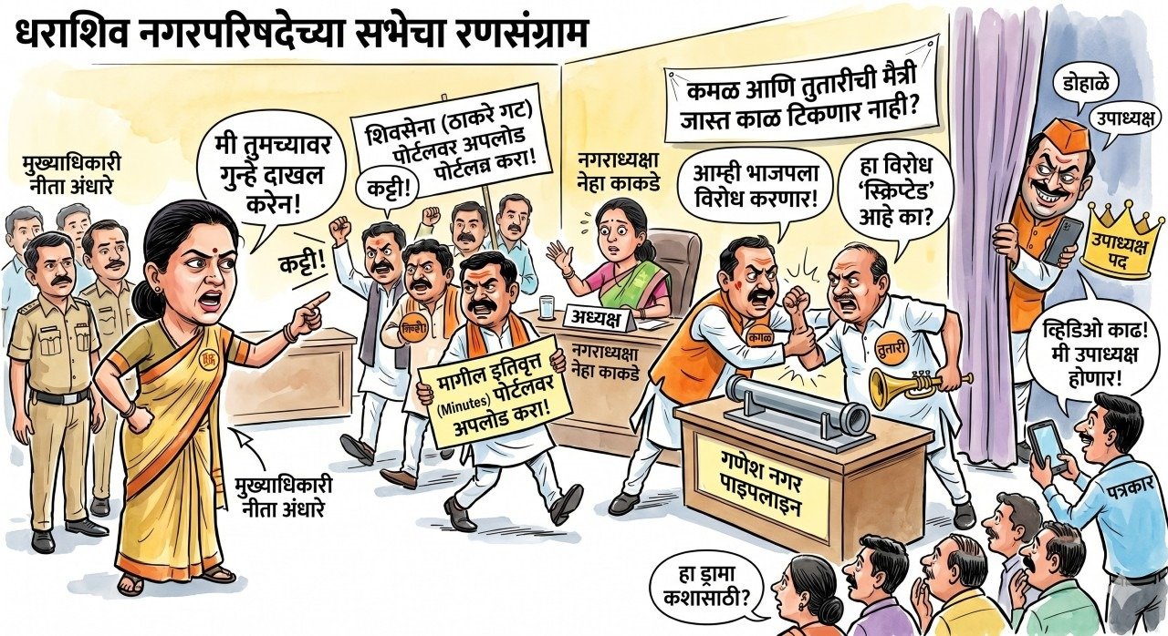 धाराशिव नगरपालिकेची सर्वसाधारण सभा म्हणजे हल्ली नेटफ्लिक्सवरच्या एखाद्या राजकीय थ्रिलर वेबसिरीजलाही लाजवेल असा ‘एंटरटेनमेंट डोस’ झाला आहे. एरवी “नगरसेवक साहेब आले, साहेब बसले” असा थाटमाट असतो, पण मंगळवारच्या सभेत मात्र स्क्रिप्ट पूर्णपणे उलटी फिरली. अधिकारी नगरसेवकांना घाबरण्याऐवजी, अधिकाऱ्यांनीच सत्ताधाऱ्यांची ‘शाळा’ घेतली आणि पडद्यामागच्या एका ‘महत्वाकांक्षी’ नेत्याने स्वतःच्याच पक्षाची ‘सुपारी’ घेऊन सभागृहात ‘बिग बॉस’चा खेळ रंगवला!