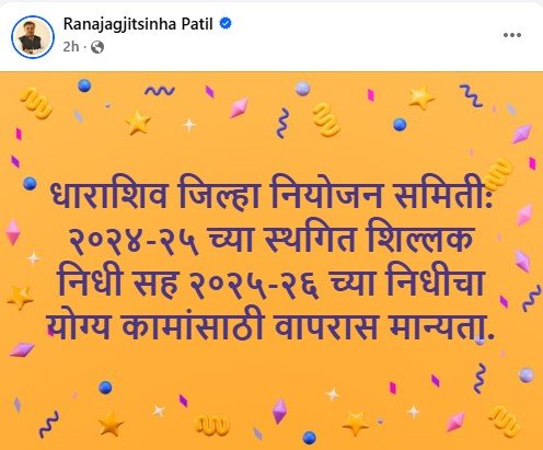 राणा पाटील यांनी आपल्या फेसबुक पोस्टमध्ये म्हटले आहे की, “धाराशिव जिल्हा नियोजन समिती: २०२४-२५ च्या स्थगित शिल्लक निधीसह २०२५-२६ च्या निधीचा योग्य कामांसाठी वापरास मान्यता.” मात्र या घोषणेसोबत शासनाचा अधिकृत आदेश किंवा पत्र न जोडल्याने त्यांच्या हेतूवरच शंका निर्माण झाली आहे. सहा महिने जिल्ह्याला विकासापासून वंचित ठेवल्यानंतर, आता केवळ टीकेला घाबरून केलेली ही घोषणा म्हणजे निव्वळ धूळफेक असल्याची संतप्त प्रतिक्रिया उमटत आहे.