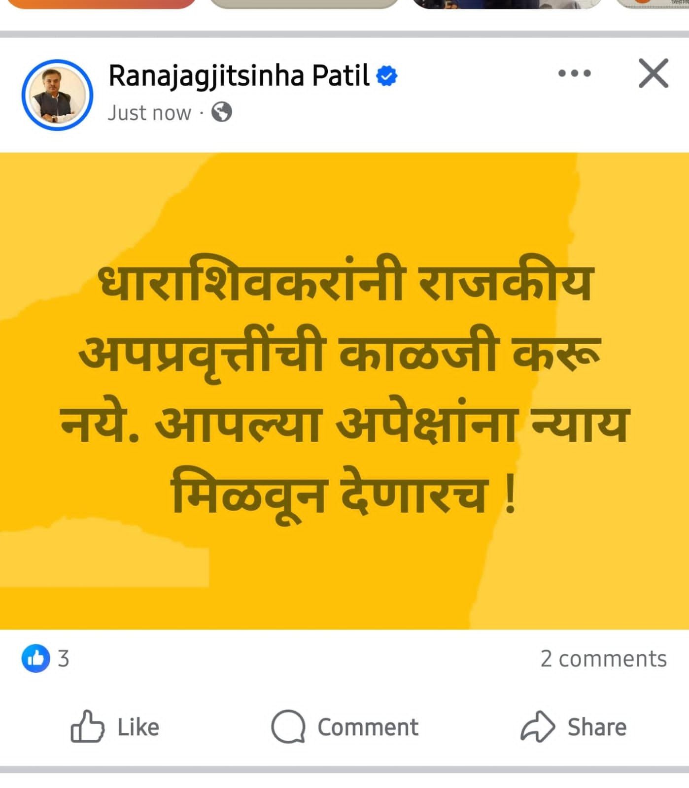 आमदार राणा पाटील यांनी बुधवारी फेसबुकवर एक पोस्ट केली. त्यात त्यांनी “धाराशिवकरांनी राजकीय अप्रवृत्तींची काळजी करू नये. आपल्या अपेक्षांना न्याय मिळवून देणारच!” असे म्हटले होते. यानंतर, आमदार पाटील यांचे समर्थक ‘शुक्राचार्य’ प्रकटल्याच्या पोस्ट करत (पालकमंत्री प्रताप सरनाईक यांच्यावर) टीका करत होते. मात्र, आता या वादात ठाकरे सेनेने उडी घेत थेट आमदार पाटलांनाच लक्ष्य केले आहे.
