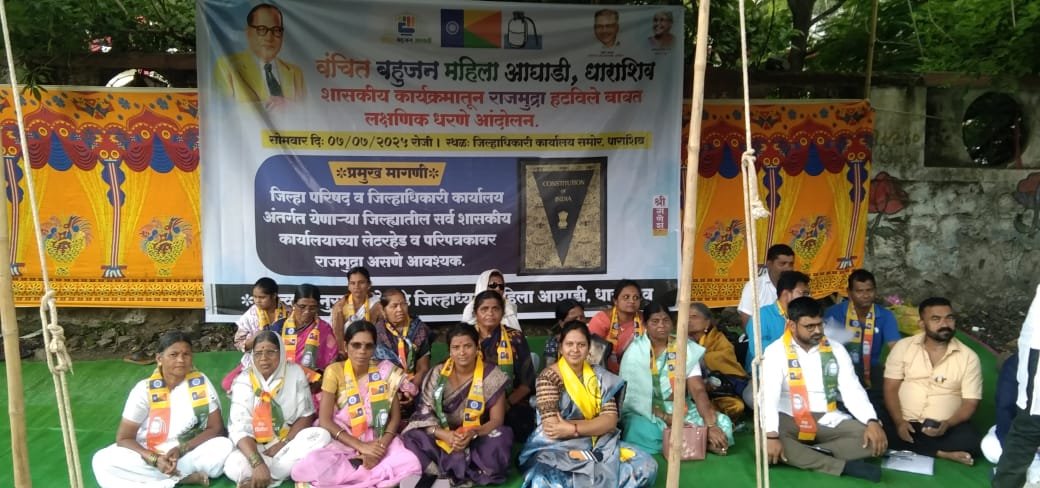 धाराशिव : केंद्र आणि राज्य सरकार शासकीय परिपत्रके आणि कागदपत्रांवरून भारतीय राजमुद्रा हटवून त्याजागी ‘सेंगोल’चा वापर करत असल्याचा आरोप करत, वंचित बहुजन महिला आघाडीने आज जिल्हाधिकारी कार्यालयासमोर धरणे आंदोलन केले. शासनाने हा प्रकार तात्काळ थांबवून सर्व शासकीय कामकाजात राजमुद्रेचा पूर्ववत वापर करावा, अशी प्रमुख मागणी यावेळी करण्यात आली.