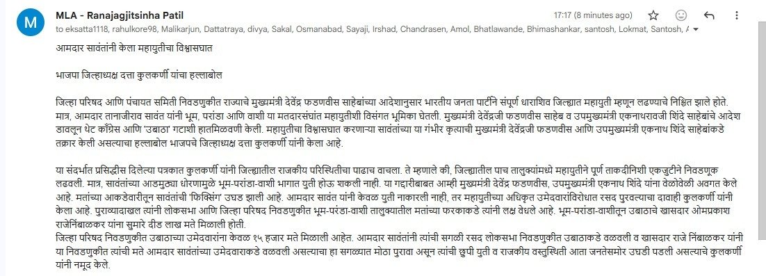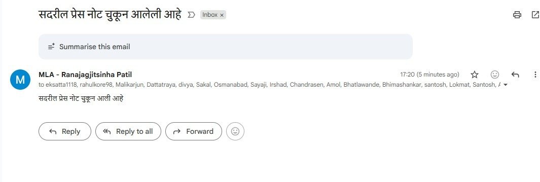 जी प्रेस नोट जिल्हाध्यक्ष दत्ता कुलकर्णी यांच्या नावाने प्रसिद्ध व्हायला हवी होती, ती चुकून थेट ‘आमदार राणाजगजितसिंह पाटील’ यांच्या पर्सनल मेल आयडीवरून पत्रकारांना धडकली!
