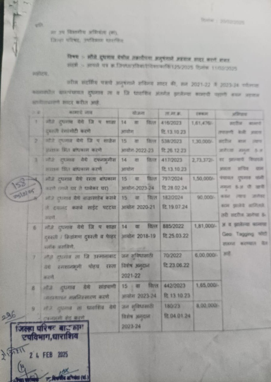 धाराशिव तालुक्यातील दुधगाव ग्रामपंचायतीतील सरपंच आणि ग्रामसेवक यांनी मिळून केलेला भ्रष्टाचार उघडकीस आला आहे. जिल्हा परिषद शाळेच्या रंगरंगोटीच्या नावाखाली तब्बल १ लाख ६१ हजार रुपयांचे बोगस बिल उचलून सरकारी निधीचा गैरवापर करण्यात आला आहे.