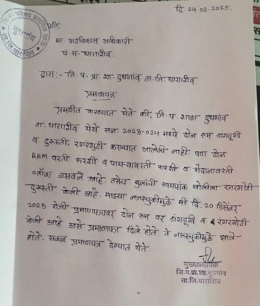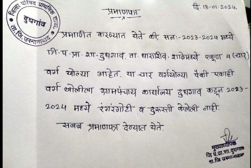 दुधगाव जिल्हा परिषद शाळेच्या चार वर्गखोल्यांना २०२३-२४ या कालावधीत रंगरंगोटी आणि डागडुजी केल्याचा दावा करण्यात आला होता. मात्र, प्रत्यक्षात एकाही वर्ग खोलीला रंगरंगोटी करण्यात आलेली नाही, असे मुख्याध्यापकांनी दिलेल्या प्रमाणपत्रात स्पष्ट करण्यात आले आहे.