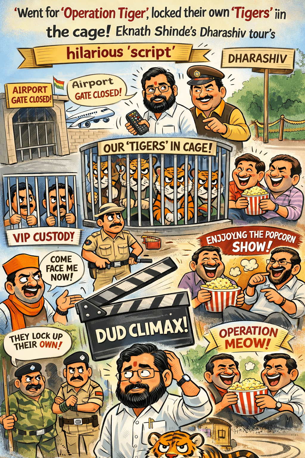 या दौऱ्याचा क्लायमॅक्स होता ‘ऑपरेशन टायगर’! अशी जोरदार हवा होती की ठाकरे गटाचे खासदार ओमराजे निंबाळकर शिंदे गटात जाणार. पत्रकार संघाच्या कार्यक्रमात दोघे एकाच मंचावर येणार होते. अख्खा जिल्हा डोळे फाडून वाट बघत होता. पण ओमराजेंनी अशी काही ‘गुगली’ टाकली की शिंदे साहेबांचा ‘क्लीन बोल्ड’ झाला! ओमराजेंनी कार्यक्रमाला थेट दांडीच मारली. “तुमच्या पक्षात तुमचेच कार्यकर्ते सुरक्षित नाहीत, तिथे मी कशाला येऊ?” असा न बोलता दिलेला हा ‘सणसणीत चिमटा’ होता. त्यामुळे ‘ऑपरेशन टायगर’चं थेट ‘ऑपरेशन म्याऊ’ झालं!