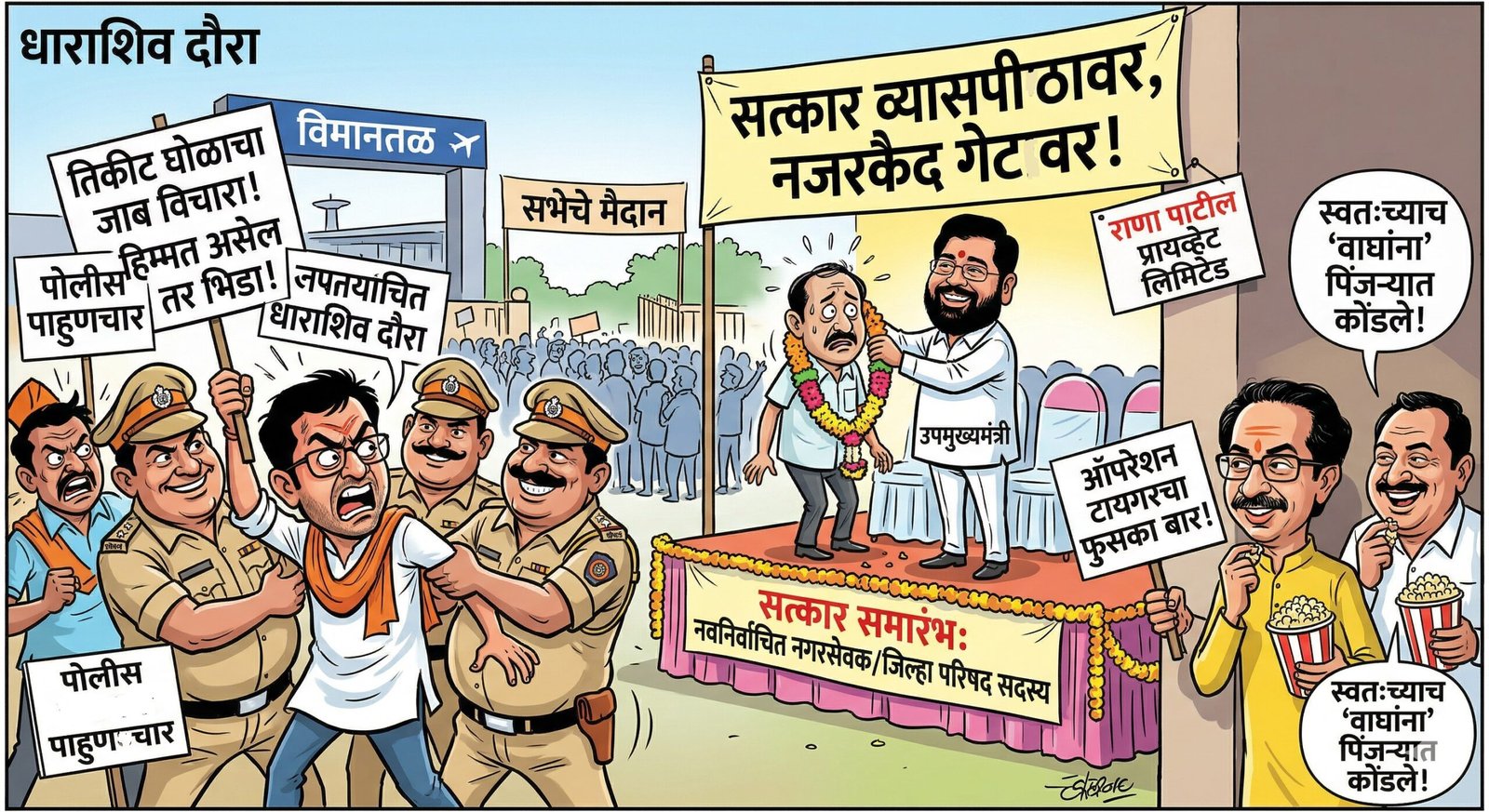 एकनाथ शिंदे यांचा हा धाराशिव दौरा त्यांच्याच पक्षासाठी ‘डॅमेज कंट्रोल’ कमी आणि ‘सेल्फ डॅमेज’ जास्त ठरला. स्वतःच्याच लोकांना न भेटता, त्यांना पोलिसांच्या ताब्यात देऊन साहेबांनी धाराशिवमध्ये जो ‘नवा आदर्श’ प्रस्थापित केलाय, त्याची चर्चा आता गल्लीगल्लीत रंगत आहे. शेवटी काय, राजकारणात स्वतःच्या सावलीला घाबरण्याची वेळ येते, तेव्हा असली धम्माल ‘स्क्रिप्ट’ जन्माला येते!