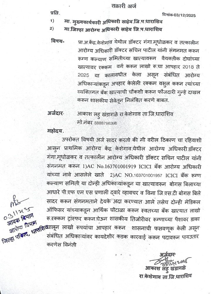 धाराशिव: धाराशिव तालुक्यातील केशेगाव प्राथमिक आरोग्य केंद्रात (PHC) कार्यरत असलेल्या वैद्यकीय अधिकारी डॉ. गंगा मूधोळकर आणि तत्कालीन आरोग्य अधिकारी डॉ. सचिन पाटील यांनी संगनमत करून शासनाची फसवणूक केल्याचा प्रकार समोर आला आहे. या दोघांनी कार्यालयाशी संबंधित असलेल्या दोन वेगवेगळ्या बँक खात्यावरून बोगस बिलांच्या आधारे लाखो रुपयांचा अपहार केल्याची तक्रार जिल्हा परिषदेच्या मुख्य कार्यकारी अधिकाऱ्यांकडे (CEO) करण्यात आली आहे.याबाबत आकाश लहु खंडागळे (रा. केशेगाव) यांनी ३ डिसेंबर २०२५ रोजी सविस्तर तक्रार दाखल केली आहे.