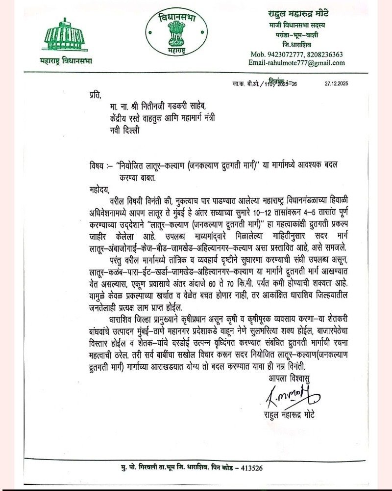 धाराशिव: नुकत्याच पार पडलेल्या हिवाळी अधिवेशनात जाहीर करण्यात आलेल्या महत्त्वाकांक्षी ‘लातूर-कल्याण (जनकल्याण द्रुतगती मार्ग)’ या महामार्गाच्या नियोजित आराखड्यात तांत्रिक व व्यवहार्य बदल करण्याची मागणी जोर धरू लागली आहे. परांडा-भूम-वाशीचे माजी आमदार राहुल मोटे यांनी यासंदर्भात केंद्रीय रस्ते वाहतूक मंत्री नितीन गडकरी यांना पत्र लिहून हा मार्ग ‘बीड’ ऐवजी ‘कळंब-पारा-ईट’ मार्गे नेण्याची मागणी केली आहे. यामुळे प्रवासाचे अंतर तब्बल ६० ते ७० किलोमीटरने कमी होईल, असा दावा त्यांनी केला आहे.