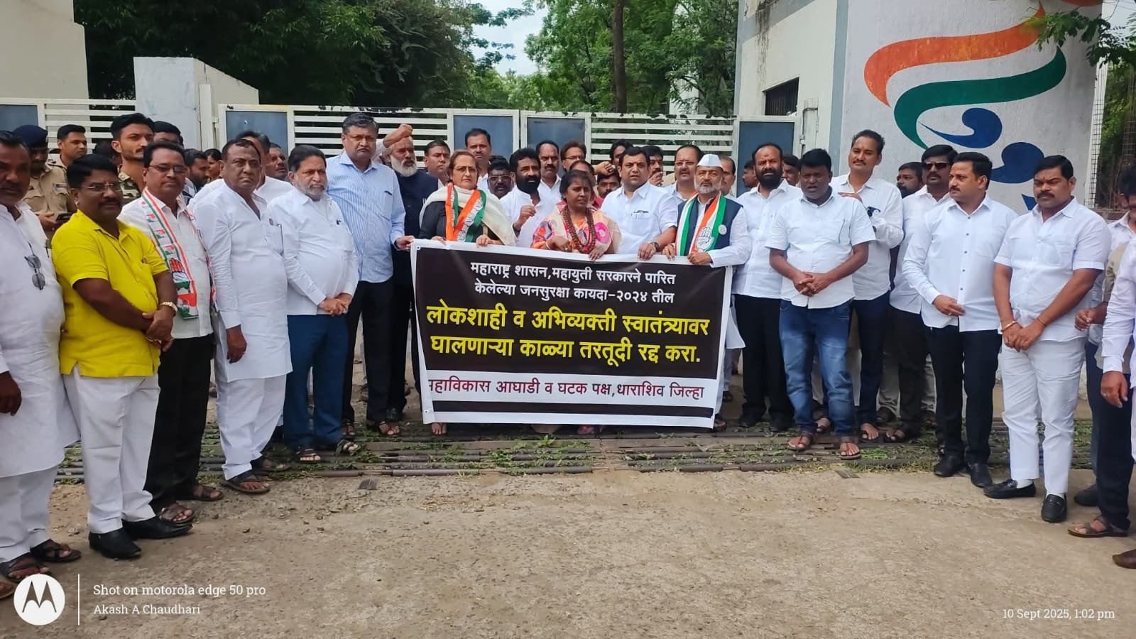 धाराशिव – “महाराष्ट्र जनसुरक्षा विधेयक २०२४” हा काळा कायदा तात्काळ रद्द करावा, या मागणीसाठी आज महाविकास आघाडीच्या वतीने धाराशिव जिल्हाधिकारी कार्यालयासमोर तीव्र आंदोलन करण्यात आले. केंद्र आणि राज्य सरकारच्या विरोधात जोरदार घोषणाबाजी करत या कायद्याचा निषेध नोंदवण्यात आला. याप्रकरणी राज्यपालांना उद्देशून लिहिलेले निवेदन जिल्हाधिकाऱ्यांना सादर करण्यात आले.