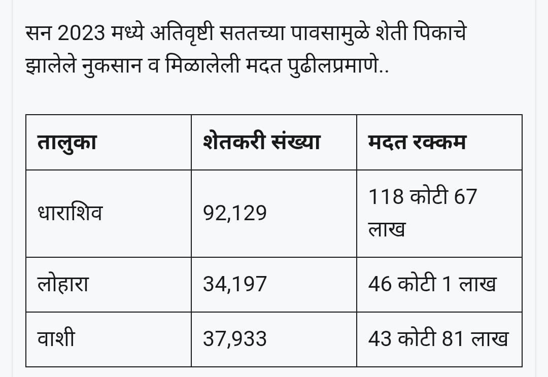 • लोहारा: ३४,१९७ शेतकऱ्यांना ४६ कोटी १ लाख रुपये.