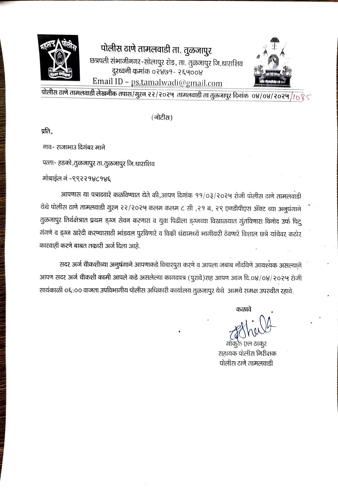 या खुलाश्यासोबत त्यांनी दिनांक ०४/०४/२०२५ रोजीच्या नोटीसची प्रत जोडली आहे. या खुलाश्यामुळे आता तुळजापूर ड्रग्ज प्रकरणाला नवे वळण लागण्याची शक्यता निर्माण झाली आहे.