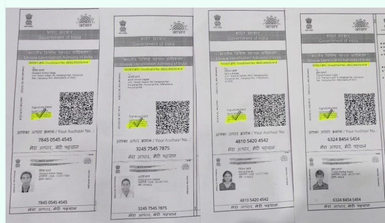 - बनावट आधारकार्ड: अर्ज दाखल करताना अस्तित्वात नसलेले बनावट आधार कार्ड वापरण्यात आले. एकाच मुलीचा फोटो वापरून वेगवेगळी नावे आणि पत्ते असलेली आधारकार्ड तयार करण्यात आली. उदाहरणार्थ, एका कार्डवर सुनील पवार (पत्ता: बेंबळी) तर दुसऱ्या कार्डवर पूनम चव्हाण (पत्ता: आरळी खुर्द, तुळजापूर) असे नाव होते. विशेष म्हणजे, या दोन्ही कार्डांचे आधार नंबर वेगळे असले तरी एनरोलमेंट क्रमांक (4892/89659/414) एकच होता. हाच एनरोलमेंट नंबर हजारो आधार क्रमांकासाठी वापरण्यात आला. सर्व आधारकार्ड २३ मे २०१९ रोजी डाऊनलोड करून जारी केल्याची तारीख दर्शवतात.
