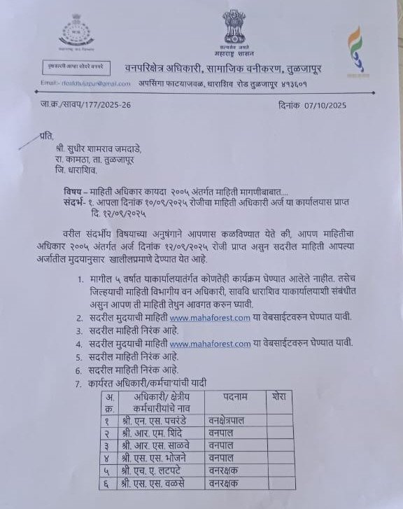 या अर्जाला उत्तर देताना वनक्षेत्रपाल, सामाजिक वनीकरण, तुळजापूर यांनी दिनांक ७ ऑक्टोबर २०२५ रोजी पत्राद्वारे कळवले आहे की, “मागील ५ वर्षांत या कार्यालयामार्फत तुळजापूर तालुक्यामध्ये कोणत्याही प्रकारचे वृक्षारोपणाचे काम करण्यात आलेले नाही.” त्यामुळे अर्जदाराने मागितलेले वृक्षारोपण, खर्च, जगलेल्या झाडांची टक्केवारी, लावलेल्या झाडांच्या जाती इत्यादी सर्व माहिती ‘निरंक’ असल्याचे विभागाने स्पष्ट केले आहे. विभागाने केवळ सध्या कार्यरत असलेल्या अधिकारी आणि कर्मचाऱ्यांची यादी उपलब्ध करून दिली आहे.