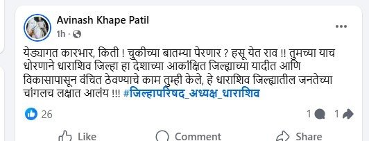 आमदार राणा पाटील यांच्या कार्यपद्धतीवर आणि सध्या सुरू असलेल्या राजकीय घडामोडींवर निशाणा साधताना अविनाश खोपे-पाटील यांनी थेट शब्दांत संताप व्यक्त केला आहे. त्यांनी आपल्या पोस्टमध्ये म्हटले आहे की: